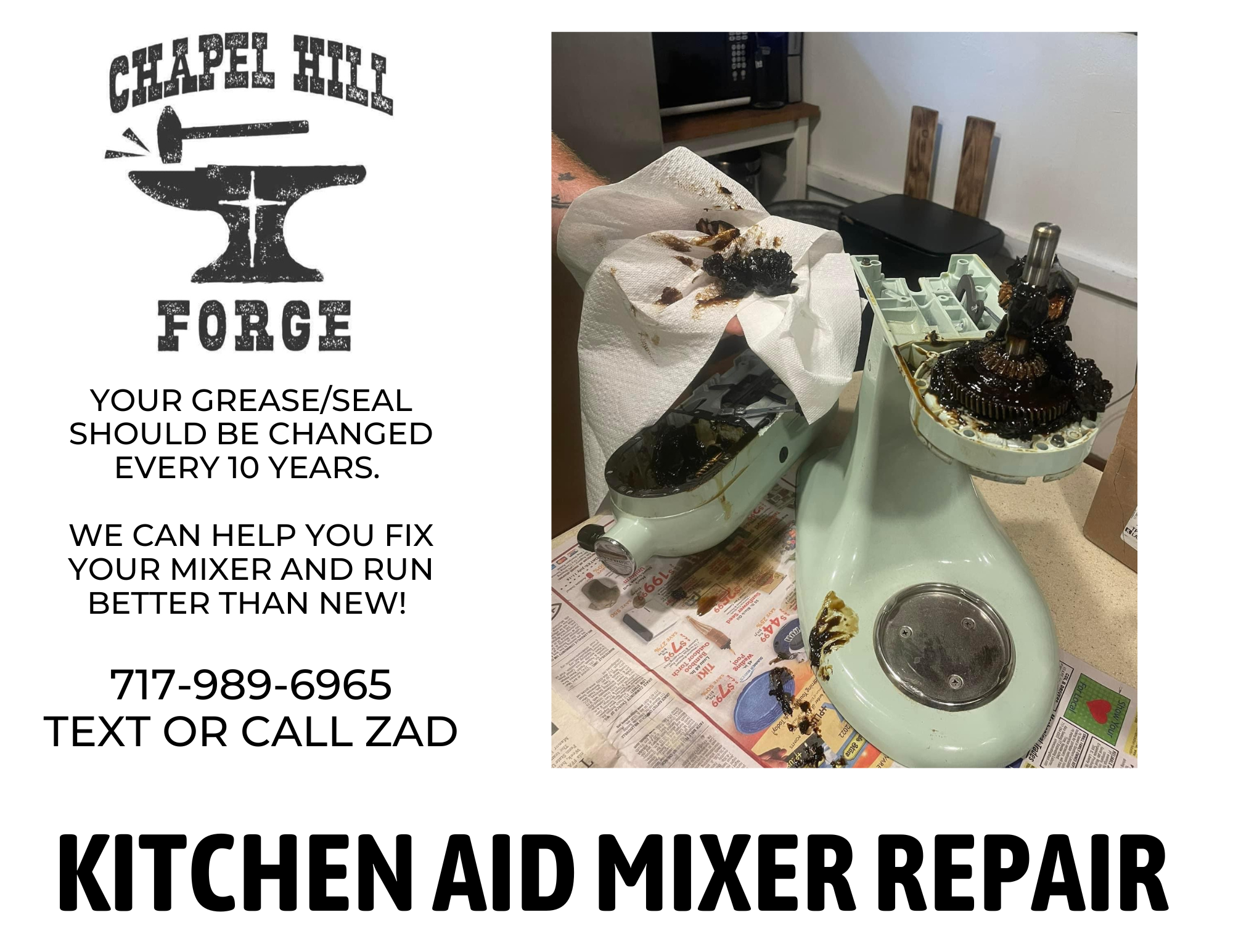 For reference, the grease should be white and pretty – not black and gross. So if you love making cookies, baking bread, and using your stand mixer for all of its great attachments, let us give it a service. We may not be able to service all brands or types, so if you have any questions, please email us at chapelhillforge@gmail.com.